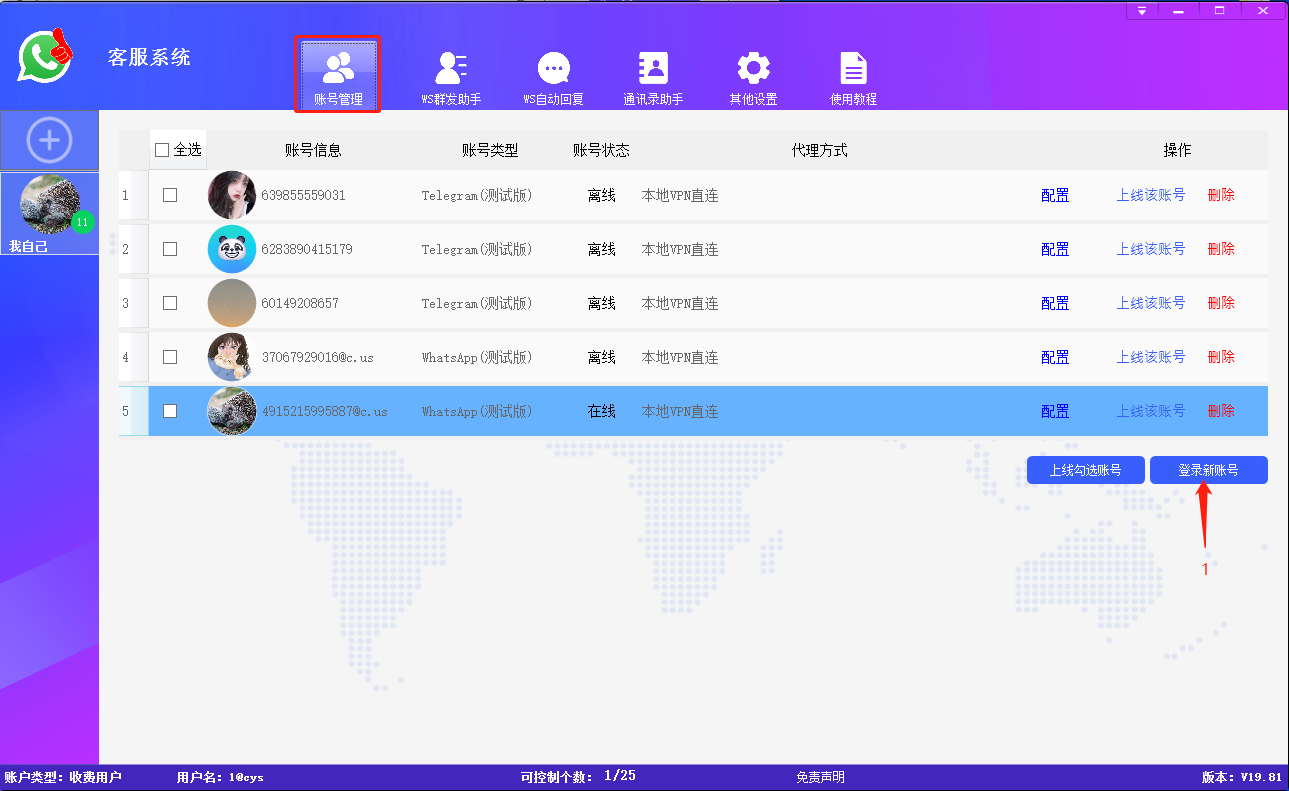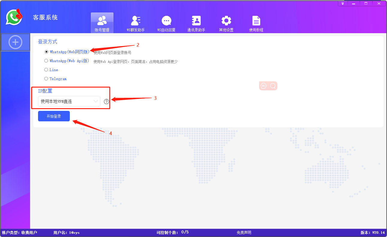 在“账号管理”下，点击“登录新账号”>在“登录方式”下选“WhatsApp(Web网页版)”>选IP配置，使用本地vpn直连>点击“开始登录”。